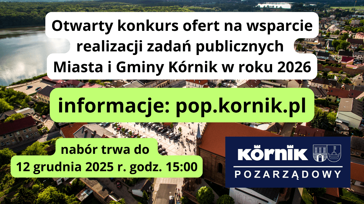 Serdecznie zapraszamy do składania ofert w ramach ogłoszonego konkursu. Państwa udział ma ogromne znaczenie dla rozwoju aktywności społecznej na terenie naszej gminy. Realizacja zadań publicznych we współpracy z organizacjami pozarządowymi stanowi ważny element budowania silnej, zaangażowanej wspólnoty lokalnej, a jednocześnie jest wyrazem dzielenia się odpowiedzialnością za inicjatywy społeczne z trzecim sektorem. Dzięki Państwa pomysłom, doświadczeniu i energii możliwe jest skuteczniejsze odpowiadanie na potrzeby mieszkańców i wspólne tworzenie przestrzeni sprzyjającej integracji, wsparciu i aktywności obywatelskiej. Oferty należy przygotować i złożyć za pośrednictwem systemu Witkac.pl (generator wniosków dostępny pod adresem: https://www.witkac.pl) w nieprzekraczalnym terminie do dnia 12 grudnia 2025 r., do godz. 15.00. Wszelkie informacje znajdziecie Państwo pod adresem: pop.kornik.pl.