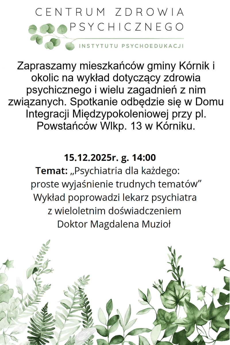 Zapraszamy mieszkańców gminy Kórnik i okolic na wykład dotyczący zdrowia psychicznego i wielu zagadnień z nim związanych. Spotkanie odbędzie się 15.12.2025 г. o godzinie 14:00 w Domu Integracji Międzypokoleniowej przy pl. Powstańców Wielkopolskich 13 w Kórniku.